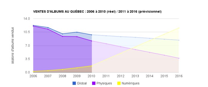 Les ventes d’albums physiques ont chuté de près de 12% (9,283 millions à 8,179 millions d’exemplaires), tandis que les ventes de formats numériques auraient augmenté de 40%. Bien que les singles numériques affichent une augmentation spectaculaire de 277% en 2010 (497 000 en 2010 contre 132 000 en 2009), la part de marché du numérique au Québec représente moins de 10% des ventes.