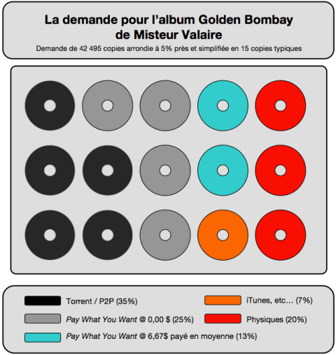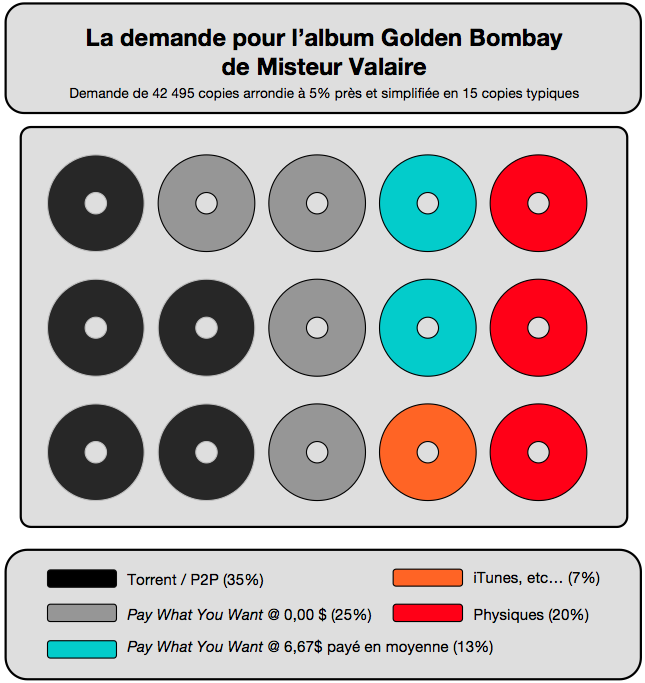 On remarque que 60% de la demande ne paye pas (via Torrent, P2P ou sur la plateforme Pay What You Want de Misteur Valaire), alors que 40% de la demande se fait par l’entremise d’une transaction payante en ligne, en magasin ou à la table des produits dérivés (en concert).