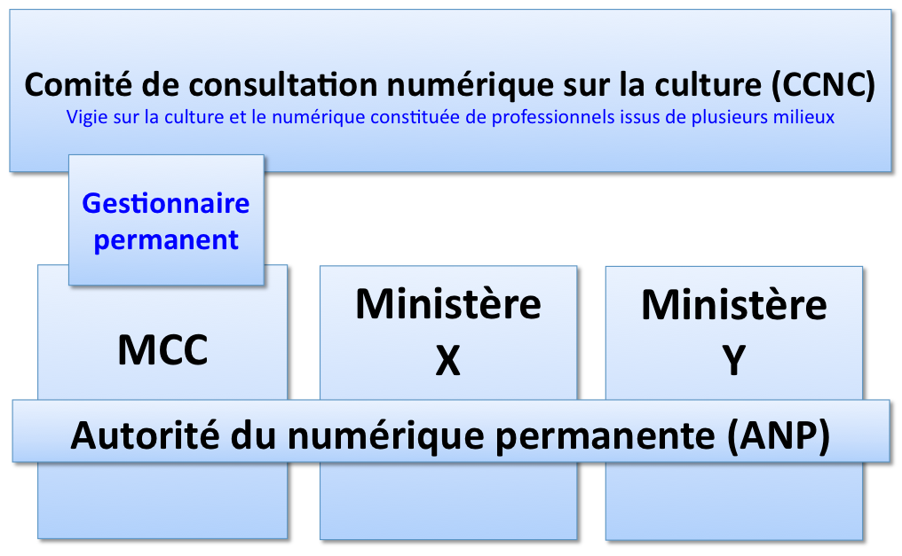 Nous recommandons que soit constituée une Autorité du Numérique Permanente (ANP) dont le mandat serait l’application des recommandations […] des politiques sur lesquelles se serait préalablement entendu le CCNC. Sous la direction du CCNC, l’ANP veillerait à la bonne marche d’un futur plan numérique de la culture du Québec. Celle-ci aurait le rôle de susciter la concertation entre les différentes industries et les différents ministères, incluant les travailleurs indépendants, et de favoriser l’innovation au sein des organisations culturelles.