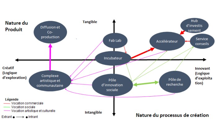 | Incubateur | Accompagnement aux entreprises et idéation | Tangible | Vocation commerciale, artistique et culturelle |